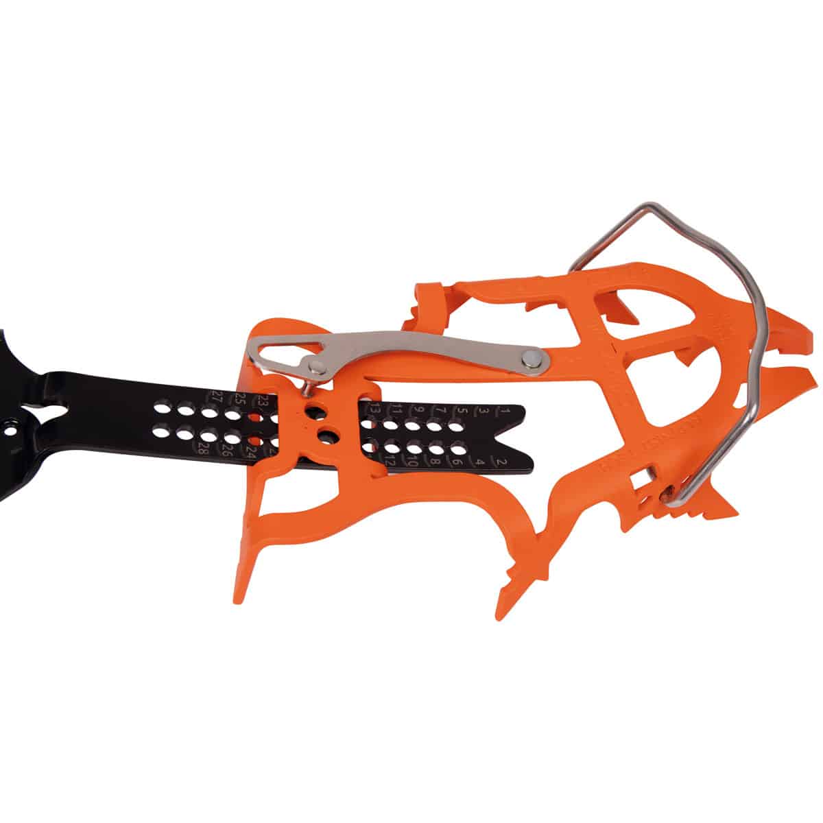 The evolution of the Alpinist Pro, the Alpinist Tech features the aggressive functionality of a mono-point with a precisely positioned secondary point for extra support and stability. Designed for technical climbing at the highest level, the Alpinist Tech is also our lightest technical ice crampon making it a great choice for top level alpinism where the secondary point provides extra stability on hard snow and mixed terrain. The walking points also feature special auxiliary points that provide extra stability on funky ice petals and cauliflowers. Using much of the same technology and innovative design as the Blade Runner crampons, the Alpinist Tech ensures a precise fit on modern boots and extra rigidity in the connection between the heel and toe platforms. This is due to the unique heel slide that integrates the micro-adjustable linking bar with the heel piece for better torsional rigidity. Constructed entirely from chromoly steel for the best energy absorption anywhere the crampons might be stressed. The elimination of the connection joints leaves little room for play and reduces much of the flex that can make crampons seem less secure on technical terrain. The Alpinist Tech is delivered standard with automatic toe and heel bails, but can convert to semi-auto with the Semi-Auto Toe Bails (ref.2453) and Semi-Auto Heel Bails (ref.2450) sold separately. The micro-adjustable linking bar allows for fine-tuning of the length. The front bail can be set in three positions for optimally positioning the front points and the heel bail can be set in two positions for different size heel lasts. The heel bail also has three height settings for the most secure attachment to the boot. Dynamic anti-balling plates use a unique design and elastic material to prevent snow build-up underfoot.