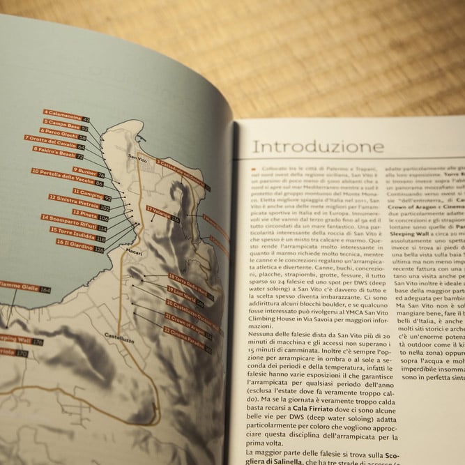 The title „Sportclimbing in Sicily – San Vito lo Capo” promises climbing with Mediterranean flair. Marble and limestone rocks with beautiful tufas lie directly next to the sea, not far from the small town of San Vito lo Capo in the northwestern part of Sicily. The southern ambiance makes this place a small paradise, offering the chance to climb almost year round. Only during the hot summer months one might prefer a cool dip in the sea. The latest guide with 25 crags around San Vito is published by Vertical-Life. The publisher continues its new format for climbing guides with this latest publication. On 192 pages, clear color-image topos, informative graphs and beautiful photos create a strong desire for a vacationing in San Vito lo Capo.