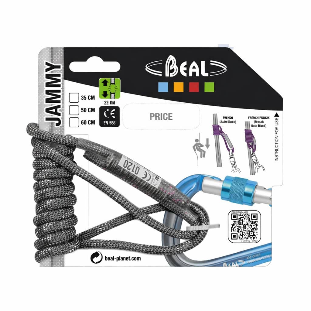 Il Beal Jammy è un cordino ad anello di corda realizzato con anima in aramide e calza in poliammide. Usato come Prusik è utilizzabile su corda singola e mezza corda, su una o entrambe le mezze corde. Perfetto per creare un nodo autobloccante aumentando la sicurezza durante una discesa su corda, o per creare un bloccante per un paranco veloce. Può essere utilizzato per allungare una protezione e per protezioni veloci.