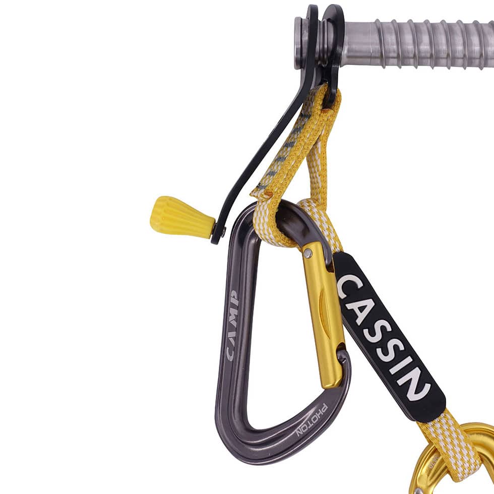 - La fettuccia in Dyneema® presenta due asole per i moschettoni: la prima, superiore, per il trasporto della vite sull’imbragatura e l’allestimento di una sosta; la seconda, inferiore, per l’uso come vite preparata e limitare l’attrito delle corde