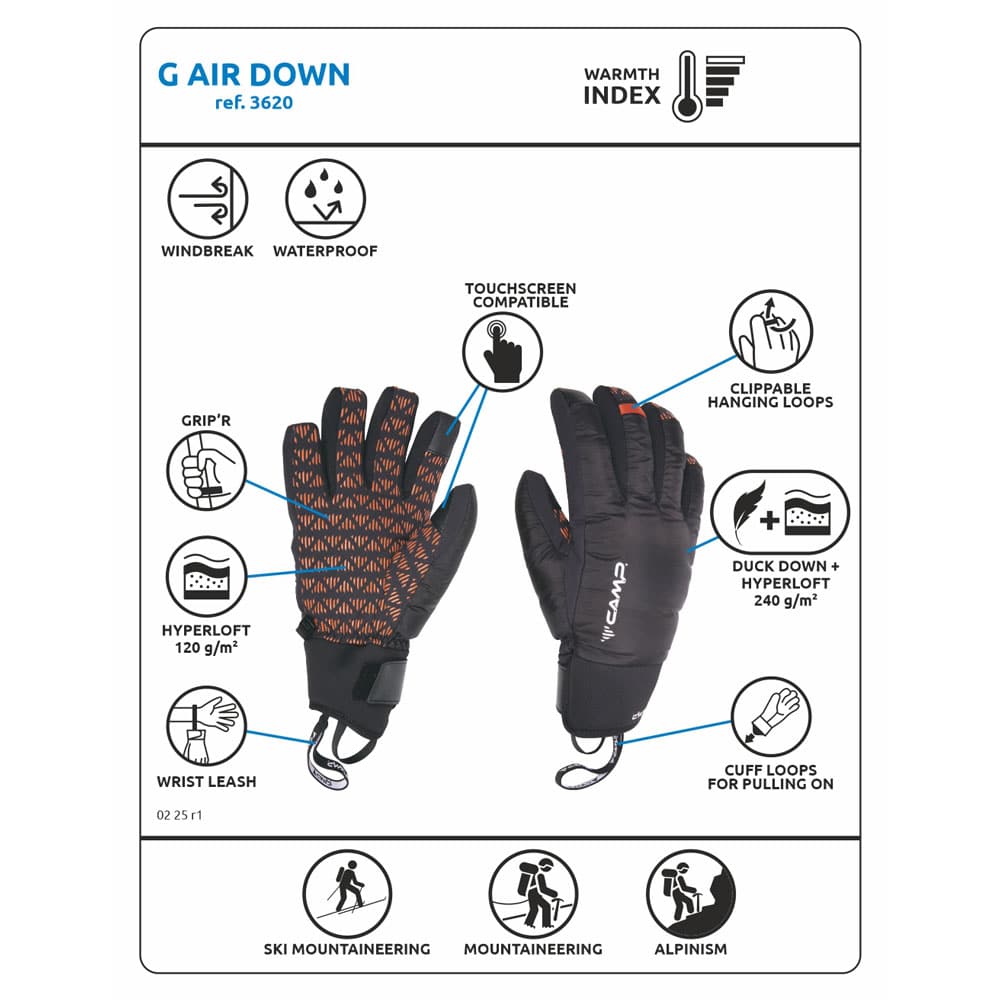 Il Camp G Air Down è il guanto studiato per le giornate più fredde, quando le mani hanno bisogno di grande protezione e allo stesso tempo devono poter compiere operazioni che sarebbero impossibili con una moffola imbottita. Il prodotto si distingue per il doppio strato di imbottitura sul dorso, dove oltre all’Hyperloft 240 g/m2 (strato interno) è presente la piuma d’anatra (strato esterno). La piuma, a parità di peso e di volume, è il miglior termoisolante disponibile e garantisce al G Air Down prestazioni eccezionali insieme a leggerezza e compattezza. La membrana DRYZONE® garantisce invece mani asciutte e traspirabilità. La sensibilità è assicurata dalla costruzione aderente con dita “Round Finger” e dai tessuti particolarmente leggeri, peculiarità della linea Air. Le stampe Grip’R in silicone sul palmo e sulle dita garantiscono una presa saldissima su bastoncini e piccozze, rendendo il prodotto polivalente e ideale per diverse attività.
