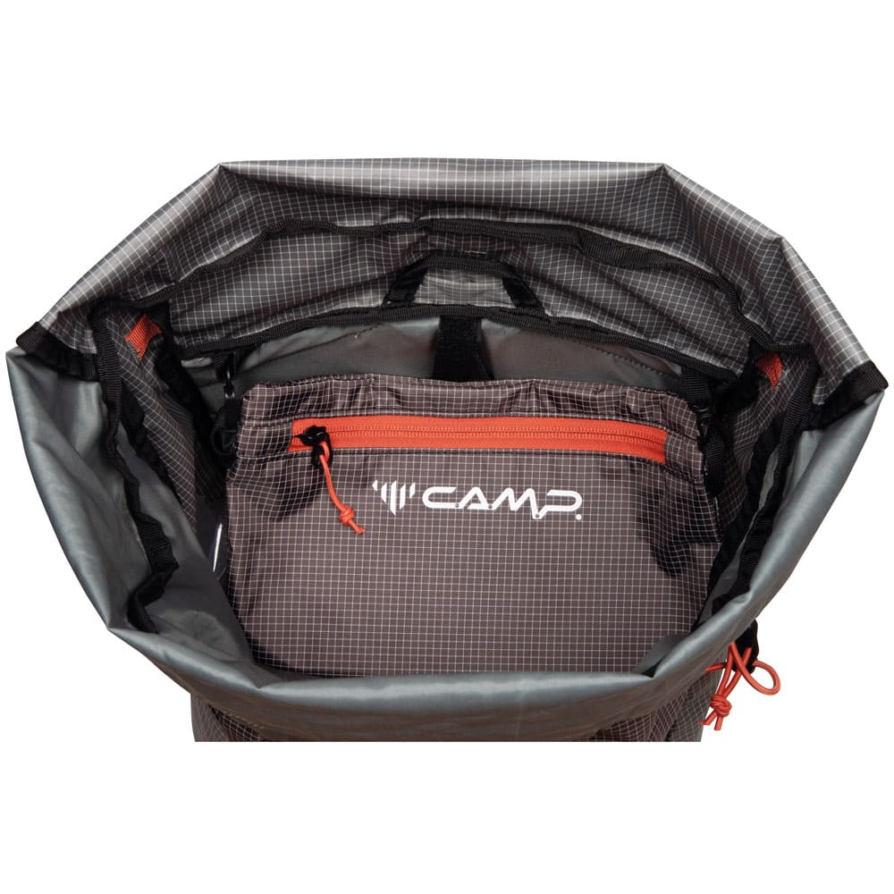 Il Camp M-Tech 30 è uno zaino da alpinismo disegnato per essere portato in parete. Comodo, leggero e funzionale, presenta una forma stretta e allungata, con un design essenziale, per garantire il massimo comfort durante la scalata. Con una capacità di 30 litri, è ideale per le ascensioni più lunghe e impegnative che richiedono una maggiore quantità di equipaggiamento. Gli spallacci sono anatomici, con imbottitura in EVA da 6 mm e particolarmente larghi nella parte superiore per consentire un’eccellente distribuzione del peso sulle spalle. Gli attacchi inferiori sono in posizione rialzata per mantenere lo zaino il più possibile aderente alla schiena, assicurando stabilità, libertà di movimento e nessuna interferenza con l’imbragatura e il materiale. La tasca interna rimovibile può essere usata separatamente oppure riposta nella parte superiore dello zaino, sopra il resto del contenuto, per avere immediatamente a disposizione accessori e altri oggetti (telefono ecc.). La patella di chiusura è studiata sia per fornire ulteriore protezione al contenuto dello zaino in caso di maltempo sia per servire come porta corda.