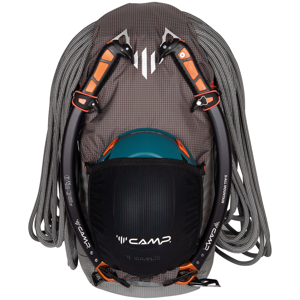 - Doppio porta piccozza con cordini elastici superiori, placchette in alluminio inferiori e vano per le lame degli attrezzi