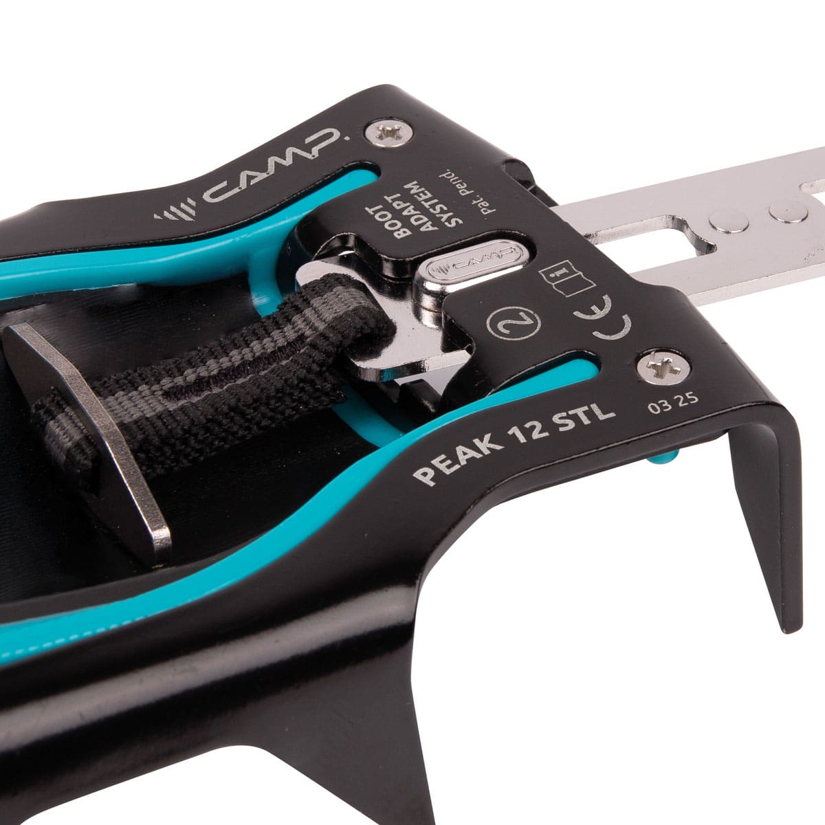 Il Camp Peak 12 STL è un rampone di nuova generazione, con costruzione innovativa per una calzata perfetta sia sugli scarponi da alpinismo sia su quelli da scialpinismo. Il Peak 12 STL è infatti dotato del rivoluzionario sistema Boot Adapt System (Pat. Pend.) che, scambiando tra loro i due puntali, consente di ottimizzare l’angolatura dell’attrezzo ai diversi tipi di calzatura senza comprometterne la stabilità laterale. Realizzato in acciaio, il Peak 12 STL è quindi il nuovo riferimento sia per l’alpinismo classico e tecnico sia per lo scialpinismo più impegnativo. La totale intercambiabilità di puntali, tacchi e sistemi di allacciatura della linea Peak permette la completa personalizzazione. I ganci anteriori automatico e universale sono forniti di serie per adattarsi a scarponi con o senza intaglio anteriore. Il gancio posteriore universale, acquistabile separatamente, consente di montare il Peak 12 STL anche su calzature prive di intaglio posteriore. L’asta in acciaio inox garantisce rigidità e allo stesso tempo flessibilità, massimizzando la stabilità del rampone su tutte le misure di scarponi.