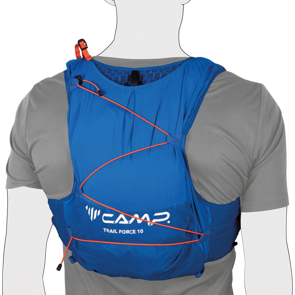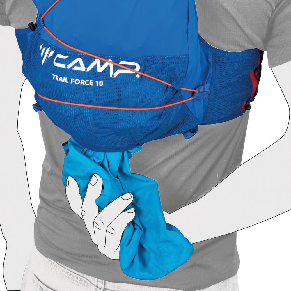Il Trail Force 10, completamente rinnovato, presenta gli stessi dettagli tecnici del Trail Force 5, da cui si differenzia per la maggiore capacità di carico. È quindi ideale per competizioni più lunghe, che richiedono una maggiore quantità di materiale, e inoltre per tutte le uscite all’aria aperta di chi vuole uno zaino estremamente comodo, che mette a immediata disposizione cibo, bevande e il resto dell’equipaggiamento. Il Trail Force 10 è infatti studiato per garantire il massimo del comfort e della funzionalità. Gli spallacci e lo schienale in rete 3D si adattano perfettamente al corpo in movimento assicurando un’eccellente ventilazione, mentre le bordature in tessuto morbido impediscono abrasioni sulla pelle e sull’abbigliamento. Il sistema di chiusura frontale è pratico e veloce, e insieme al sistema di regolazione laterale assicura un fitting perfetto e la massima stabilizzazione del carico. L’innovativo porta bastoncini, derivato dal porta sci X-Press degli zaini da scialpinismo, consente di riporre o estrarre gli attrezzi senza fermarsi. Il sistema presenta elastici separati con clip da fissare direttamente a ciascun bastoncino (appena sotto l’impugnatura) prima della gara. Un apposito moschettone permette di collegare tra loro gli elastici (e quindi i bastoncini) e di fissare rapidamente questa estremità degli attrezzi a una delle asole posteriori dello zaino. L’altra estremità (quella del puntale) si fissa invece mediante un gancio (dotato di elastico, regolabile e rimovibile) a uno degli spallacci.