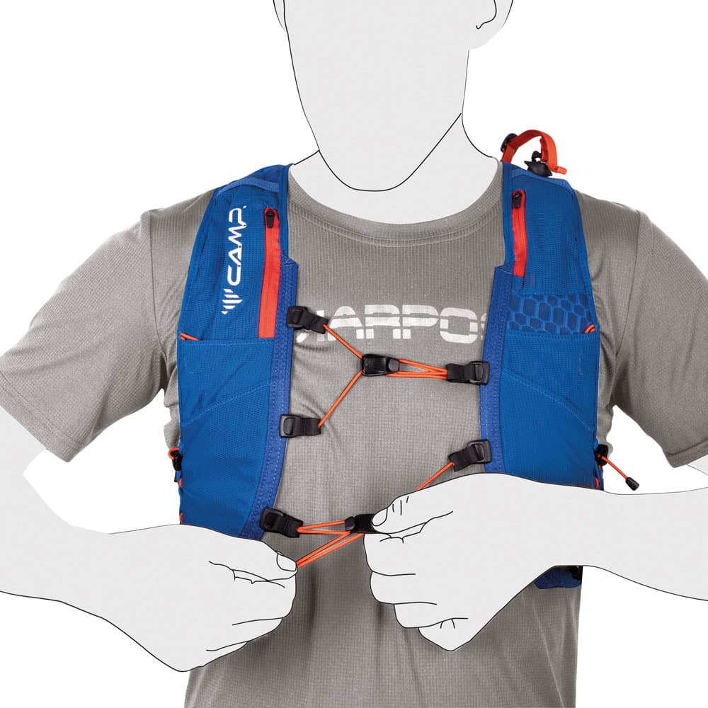 • 2 tasche porta Soft Flask sugli spallacci, compatibili con le SF 300 ml e 600 ml e provviste di cordino elastico per tenere in posizione le borracce quando non sono piene