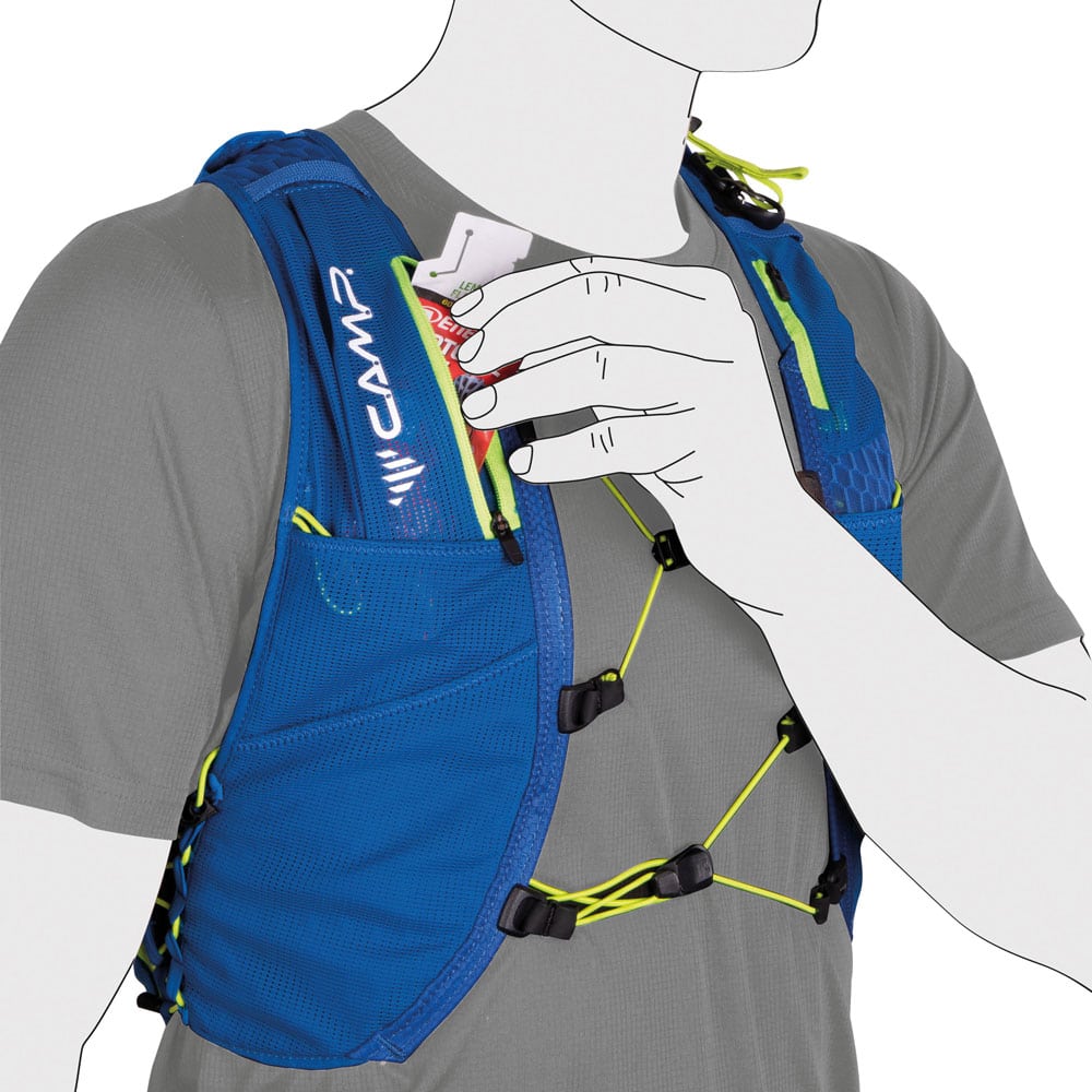 • 2 tasche porta Soft Flask sugli spallacci, compatibili con le SF 300 ml e 600 ml e provviste di cordino elastico per tenere in posizione le borracce quando non sono piene
