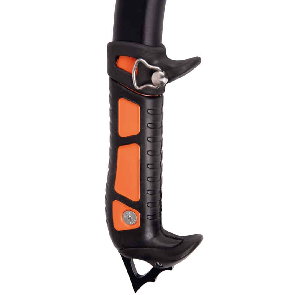 L’impugnatura è completamente personalizzabile e adattabile alla grandezza delle mani dell’alpinista e al tipo di terreno che si sta affrontando. Il puntale in acciaio consente l’uso in appoggio e presenta un foro moschettonabile per la longe. L’impugnatura modulare è dotata di appoggi amovibili che permettono tutte le configurazioni: completa con 2 appoggi, con il solo appoggio inferiore e senza appoggi per la progressione esclusivamente su neve. L’appoggio superiore è regolabile, potendo essere spostato in qualsiasi punto del manico in funzione delle esigenze dell’alpinista.