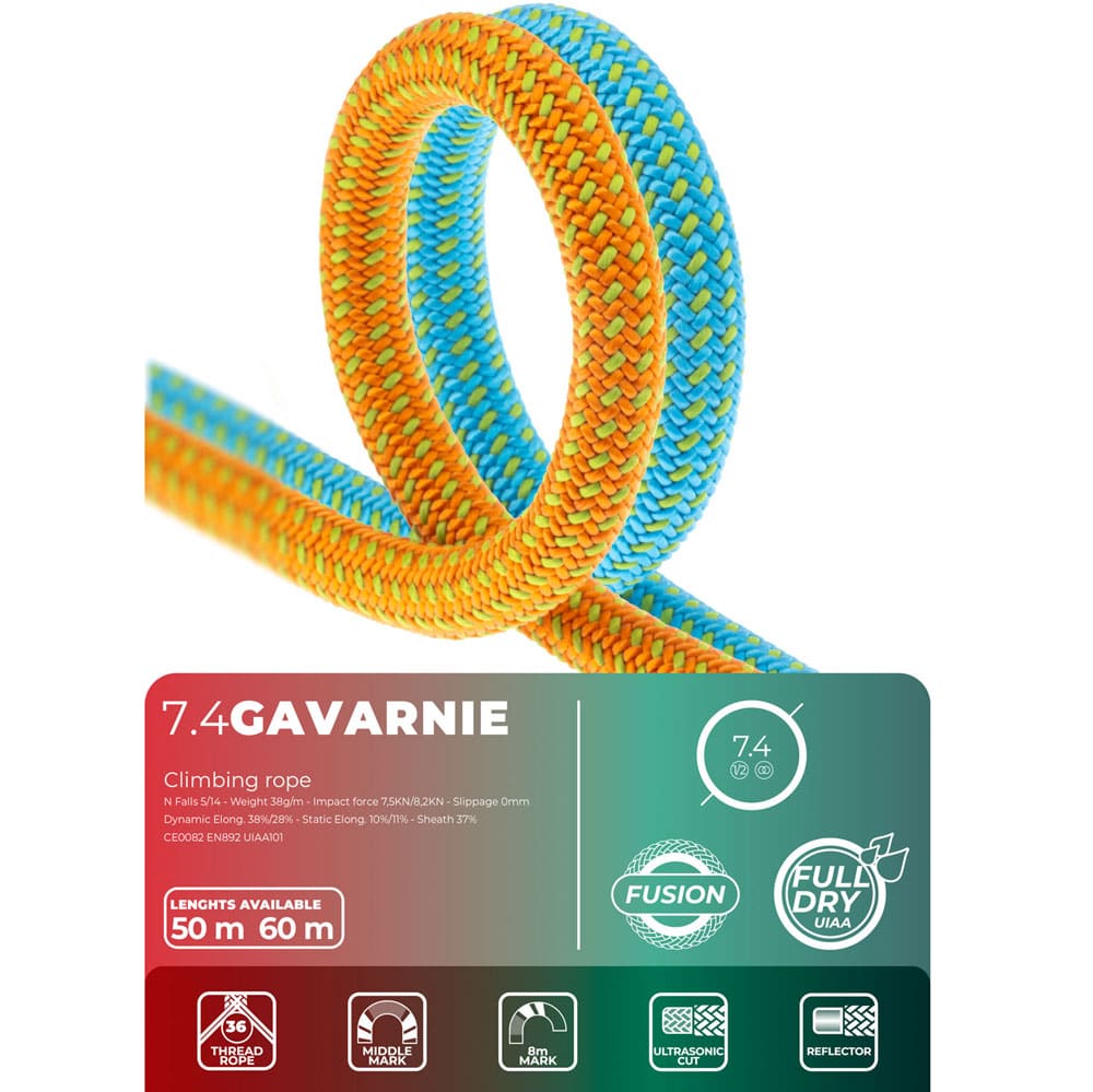 La Fixe Gavarnie 7.4 mm è una corda totalmente impermeabile ad alte prestazioni con doppia certificazione (mezza e gemella), progettata per offrire il massimo della versatilità in ambiente alpino. Con un peso contenuto di soli 38 g/m, consente progressioni rapide e fluide, riducendo al minimo attrito e ingombro nello zaino.